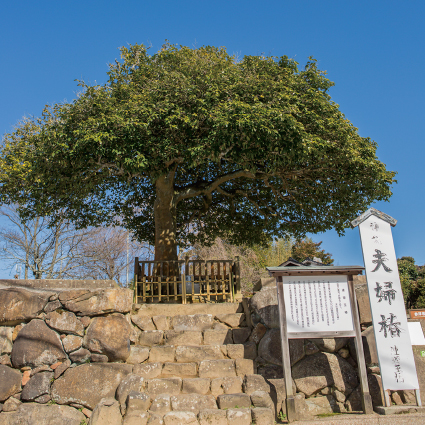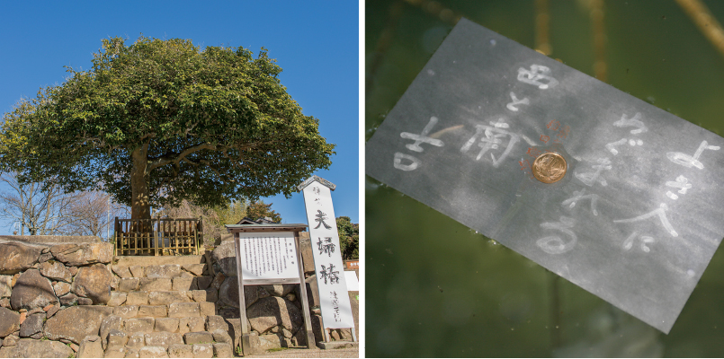 イナタヒメノミコトが地に立てた2 本の枝が成長して一本になったという伝説をもち、一心同体の夫婦をイメージさせる「連理玉椿」(別名・夫婦椿)
